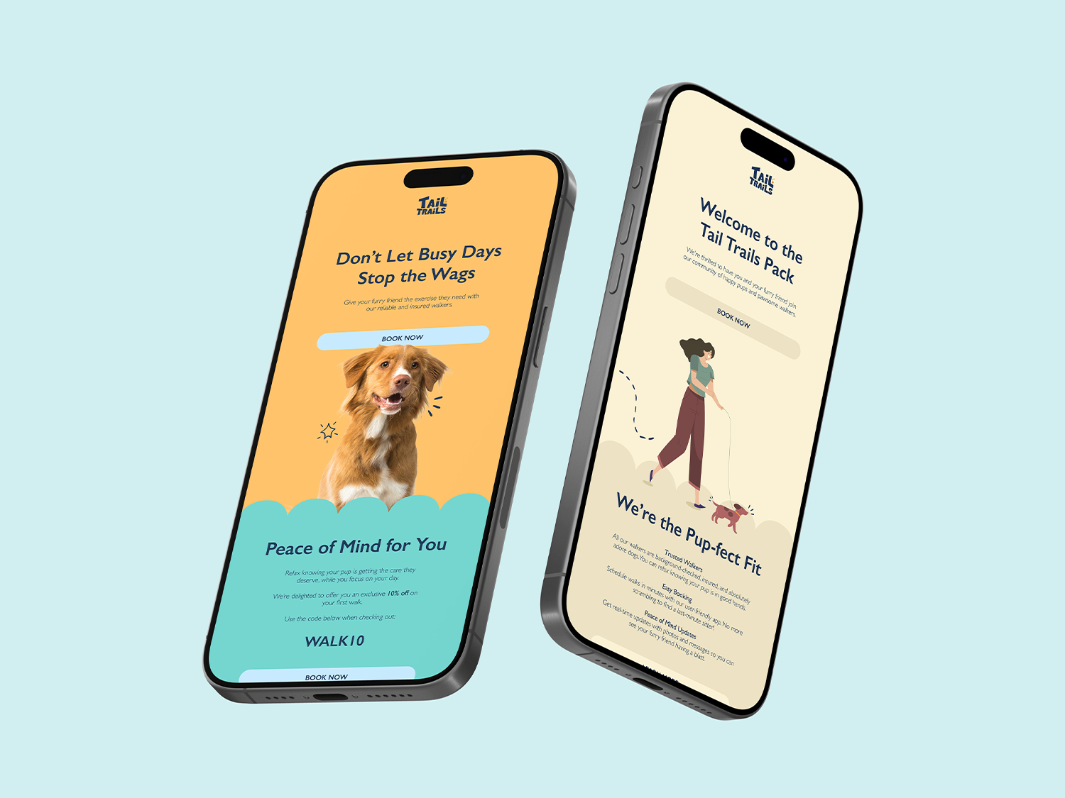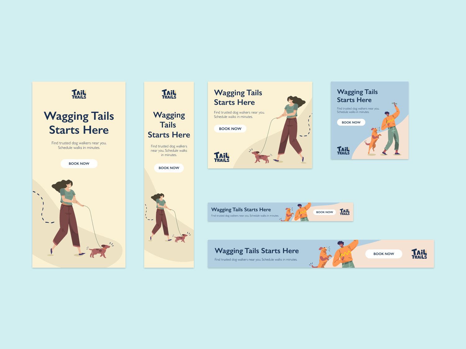 Google Banner Ads: Developing visually appealing banner ads for Google Display Network featuring happy dogs on walks, paired with concise messaging.